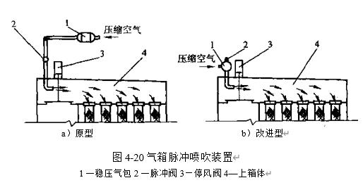 與其他噴吹裝置不同,氣箱脈沖噴吹裝置不設(shè)噴吹管,也不設(shè)引射器,而是直接將脈沖閥釋放出來(lái)的壓縮氣體輸入除塵器的上箱體,使上箱體在瞬間形成正壓,并傳遞到濾袋內(nèi),從而實(shí)現(xiàn)清灰.