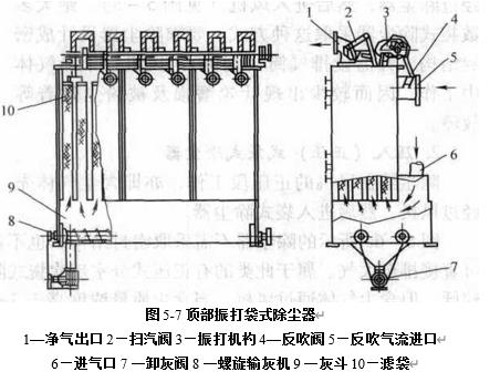 頂部振打袋式除塵器主要由箱體,灰斗和振打機(jī)構(gòu)等組成.由于清灰的需要,除塵器分設(shè)若干倉(cāng)室.置于倉(cāng)室內(nèi)的濾袋下端開(kāi)口,固定于倉(cāng)室下部的底板上,以帽蓋封閉的上端吊掛在振打機(jī)構(gòu)的吊架上.在箱體上裝有閥門(mén)及振打機(jī)構(gòu).