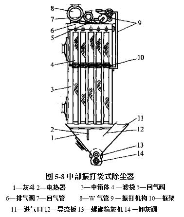 中部振打袋式除塵器的結(jié)構(gòu),含塵氣體由進(jìn)口進(jìn)入中箱體,凈化后經(jīng)由排氣閥和排氣管排出.清灰時(shí),振打裝置將排氣閥關(guān)閉,回氣閥開(kāi)啟,并驅(qū)使位于濾袋中部的框架振動(dòng),由于振動(dòng)和回氣的作用,附著在濾袋內(nèi)表面的粉塵被清落.