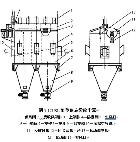 菱形扁袋除塵器選用外濾形式.除塵布袋為菱形,沿扁長(zhǎng)形除塵布袋的垂直方向縫成多個(gè)通道,并以叉形框架撐開(kāi),其橫斷面形成一個(gè)個(gè)相連的菱形.每一條除塵布袋的過(guò)濾面積達(dá)Um2,比其他形狀的除塵布袋面積大得多,可充分利用箱體空間.除...