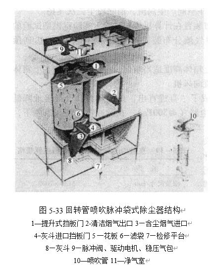 回轉(zhuǎn)管噴吹脈沖袋式除塵器由灰斗,中箱體(塵氣室),上箱體(凈氣室)以及噴吹清灰裝置組成.一臺(tái)除塵器包含若干個(gè)過(guò)濾單元,每個(gè)單元有數(shù)百至上千條濾袋,沿著多個(gè)同心圓布置,采取外濾形式.濾袋呈扁圓形,其等效圓直徑為127mm,...