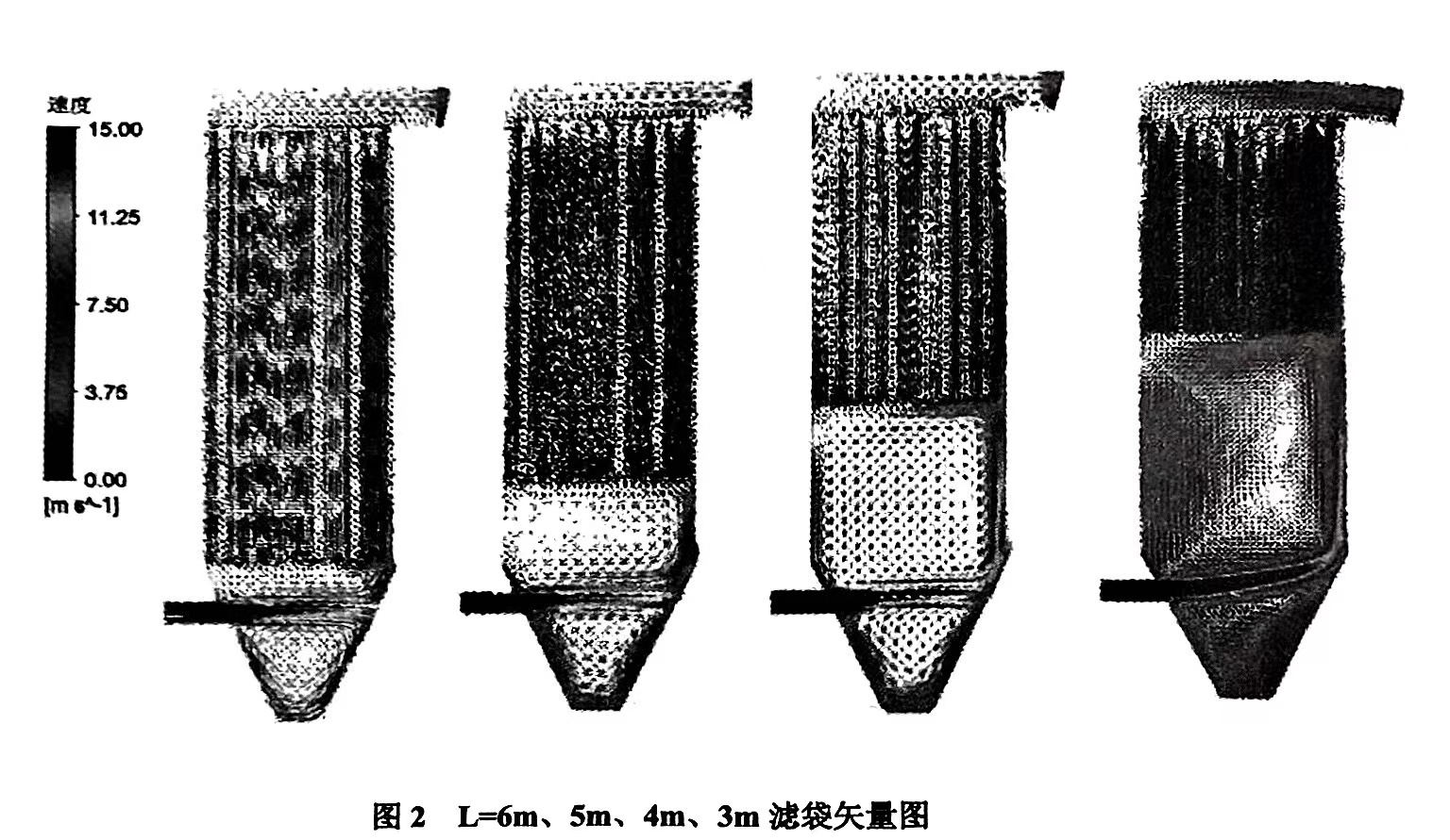 在袋式除塵器中遠離進風口處濾袋承擔風量較大。隨濾袋長度縮短,除塵器內部空間增大,在濾袋下部與灰斗之間容易發(fā)生渦旋,造成內部速度分布及濾袋風量分配不均勻,出口對側流速過高。濾袋為6m長時,除塵器內各濾袋流量的分配和內部流場...