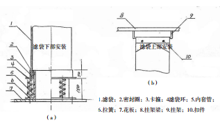 1)取消濾袋上端口吊帽、彈簧及拉鏈,改用圖1中(b)所示扣件10,將濾袋上端固定在掛架梁8下的掛架9上。 (2)在花板上平面安裝圖1(a)所示的向下拉緊裝置,該裝備由密封圈2、卡箍3、濾袋環4、內套管5、彈簧6組成。內套...